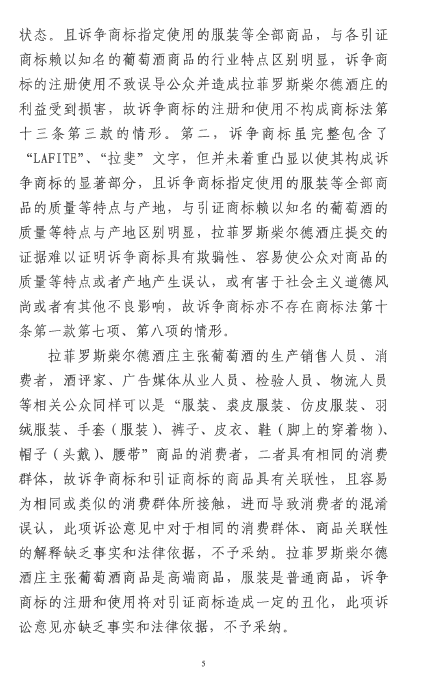 本案是一起適用“淡化”理論保護(hù)馳名商標(biāo)的典型案例。在論理部分,法院指出,訴爭(zhēng)商標(biāo)使用在服裝商品上,會(huì)使相關(guān)公眾聯(lián)想到引證商標(biāo),且會(huì)認(rèn)識(shí)到使用訴爭(zhēng)商標(biāo)的商品并非由拉菲羅斯柴爾德酒莊提供或與之存在特定關(guān)聯(lián)。也就是說,法院認(rèn)為此時(shí)混淆、誤認(rèn)的可能性并不存在。但是,這種狀況的存在依然會(huì)損害引證商標(biāo)權(quán)利人的利益,因?yàn)橐C商標(biāo)的顯著性被淡化了,引證商標(biāo)與其權(quán)利人之間的固定聯(lián)系被破壞了。