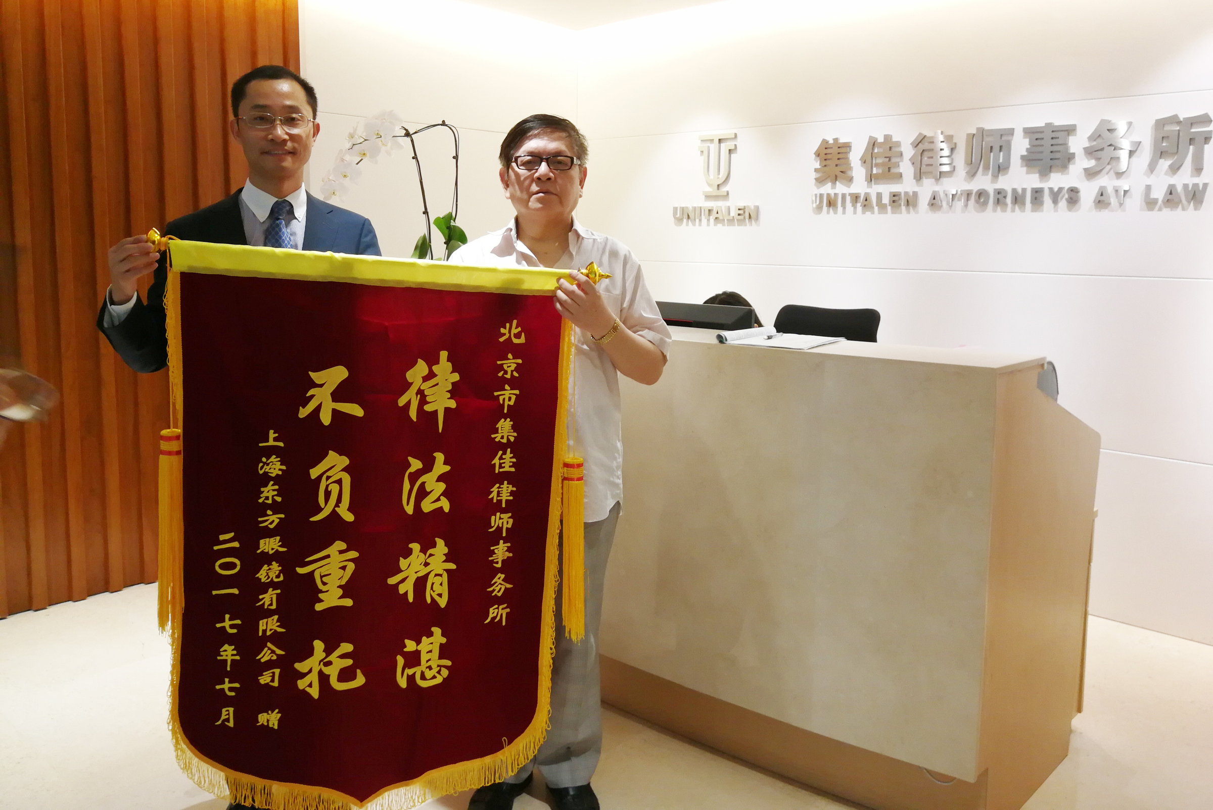 7月19日,上海東方眼鏡有限公司法定代表人李定法先生親臨集佳贈(zèng)送錦旗,以感謝集佳律師事務(wù)所為成功保護(hù)滬上老字號(hào)“東方眼鏡”所付出的努力。