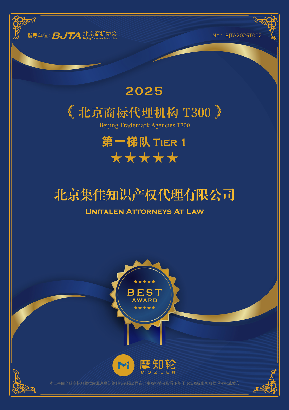 近日,北京商標(biāo)協(xié)會(huì)成立30周年慶典暨商標(biāo)發(fā)展大會(huì)在京隆重舉行,會(huì)上正式發(fā)布“北京商標(biāo)代理機(jī)構(gòu)T300”榜單。北京集佳知識(shí)產(chǎn)權(quán)代理有限公司憑借在商標(biāo)領(lǐng)域過硬的專業(yè)實(shí)力和卓越的專業(yè)服務(wù),榮譽(yù)入選2025年度北京商標(biāo)代理機(jī)構(gòu)T300——第一梯隊(duì)TIER 1。