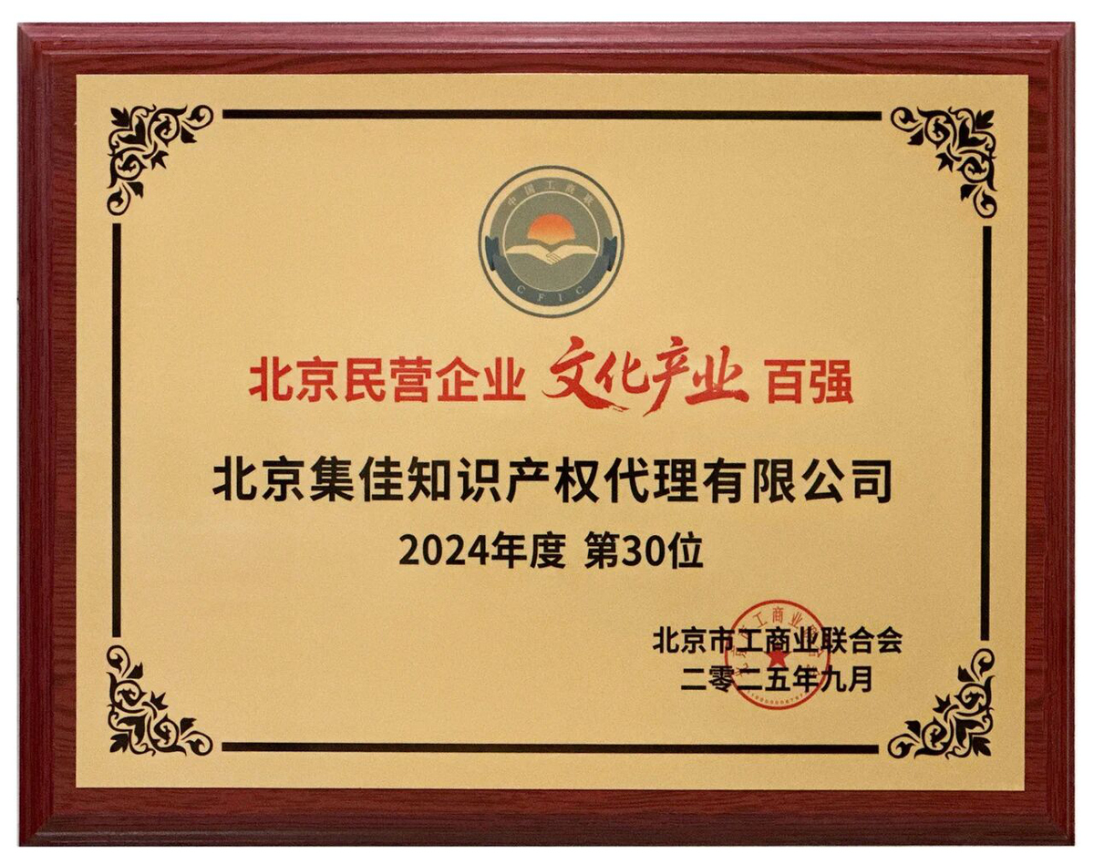 2025年9月19日,北京市工商業(yè)聯(lián)合會重磅發(fā)布 “2025北京民營企業(yè)百強榜單”。北京集佳知識產(chǎn)權(quán)代理有限公司連續(xù)第三年榮登“北京民營企業(yè)文化產(chǎn)業(yè)百強”榜,位列第30位,較上年排名大幅提升32個名次,充分彰顯了集佳卓越的綜合實力與良好的社會形象。