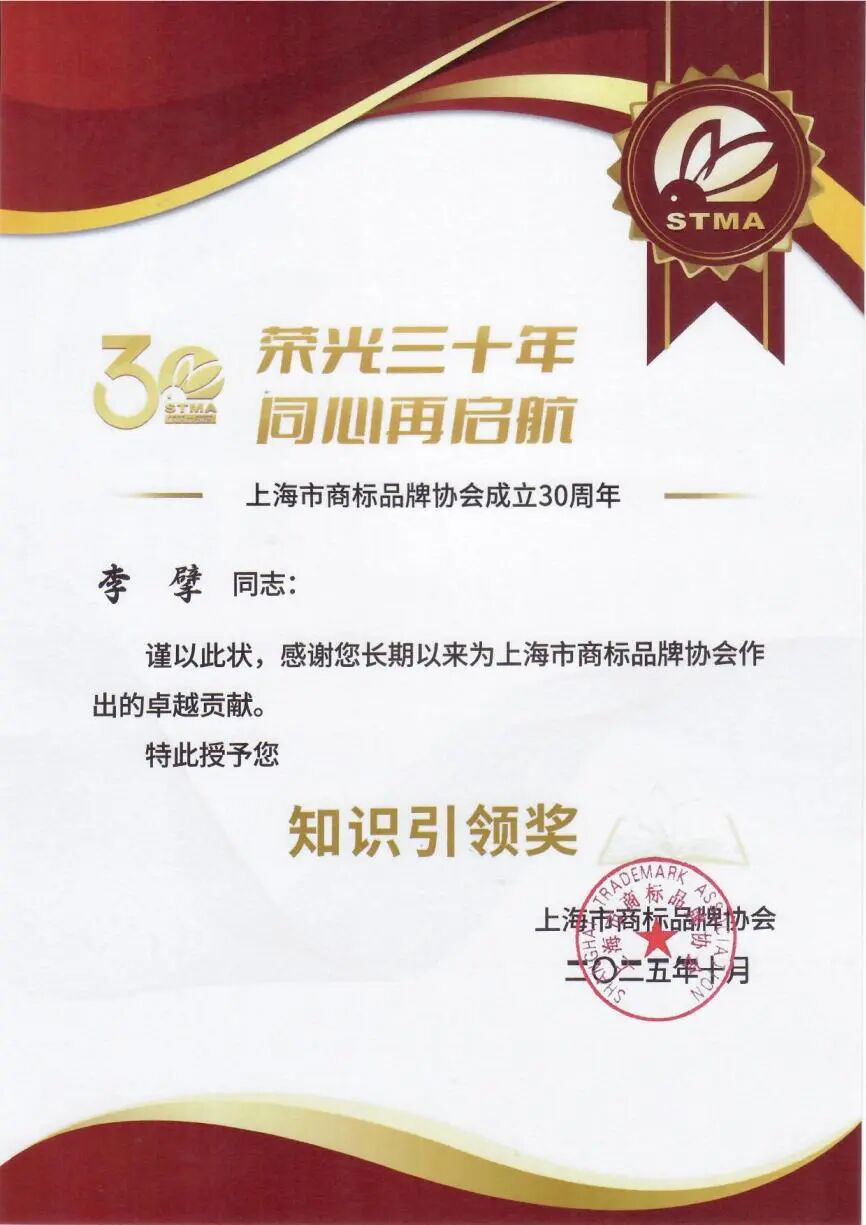 2025年10月16日,“榮光三十年·同心再啟航”上海市商標品牌協(xié)會成立30周年慶典在上海隆重開幕,會上表彰了對商標品牌領(lǐng)域作出突出貢獻的單位及個人,表彰了2024-2025年度典型商標代理案例、典型商標代理案例提名。